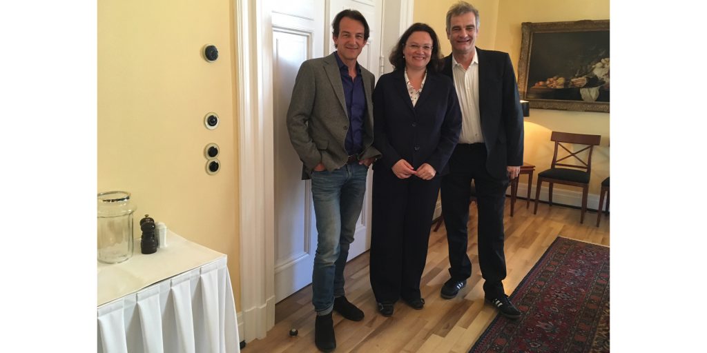Sei es nun die Suche nach passenden Lösungen für unseren Arbeitslosengeld-1-Anspruch oder für unsere Altersvorsorge, der Skandal mit unseren „ehrenamtlichen“ Hochschuldrehs, die Frage der korrekten Sozialversicherung unserer Schauspielengagements, die KSK-Problematik, die ZAV – die meisten „Baustellen“, auf denen der BFFS in unserem Sinne ackert, berühren Bereiche, die auf Seite der Regierung vom Bundesministeriums für Arbeit und Soziales (BMAS) und seiner Ministerin, Andrea Nahles (SPD), verantwortet werden. Umso erfreulicher ist, dass Frau Nahles am 1. Juni höchstpersönlich Zeit fand, mit BFFS-Vorständen über die zentralen Belange von Schauspielerinnen und Schauspielern zu beraten.