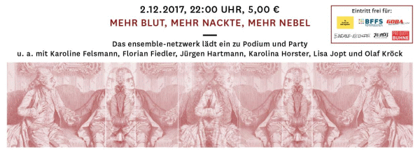 Das ensemble-netzwerk lädt am Samstag, den 2. Dezember ein zu Podium und Party, u. a. mit Karoline Felsmann, Florian Fiedler, Jürgen Hartmann, Karolina Horster, Lisa Jopt und Olaf Kröck.